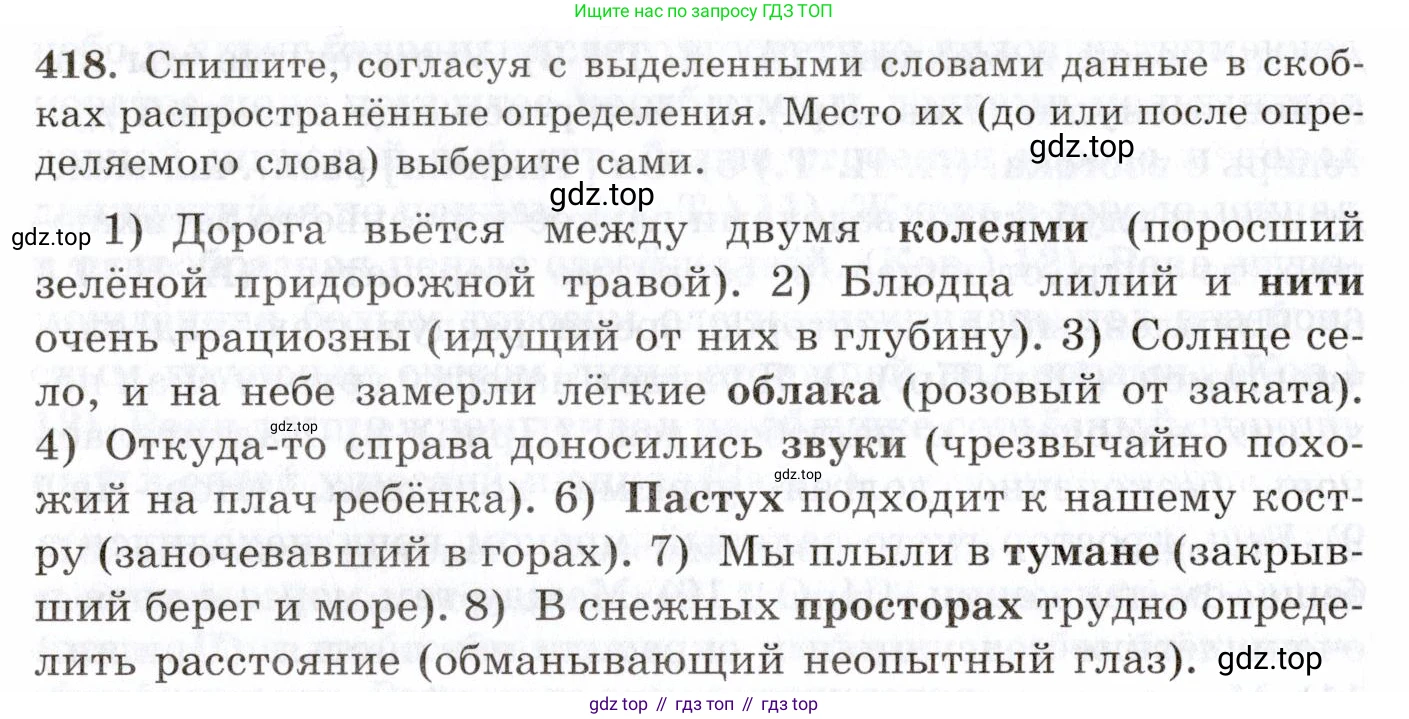 418. Спишите, согласуя с выделенными словами данные в скобках распространённые определения. Место их (до или после определяемого слова) выберите сами.