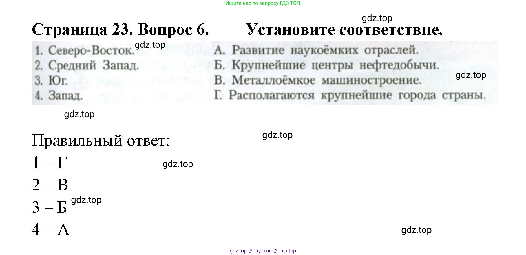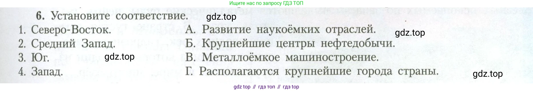 1. Северо-Восток. 2, Средний Запад. 3. Юг. 4. Запад. | А. Развитие наукоёмких отраслей. Б. Крупнейшие центры нефтедобычи. В. Металлоёмкое машиностроение. Г. Располагаются крупнейшие города страны. |