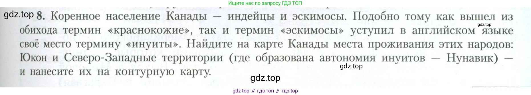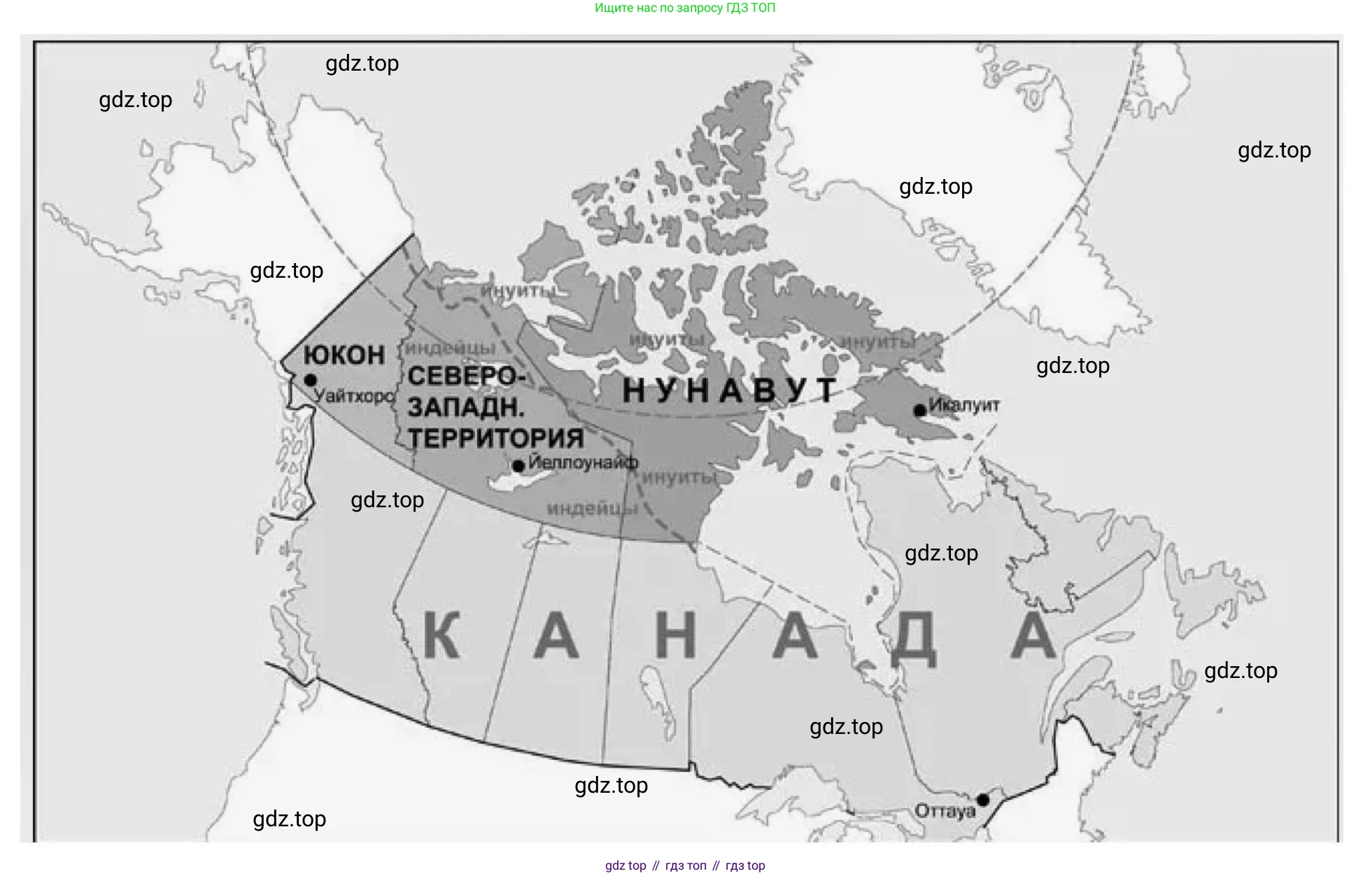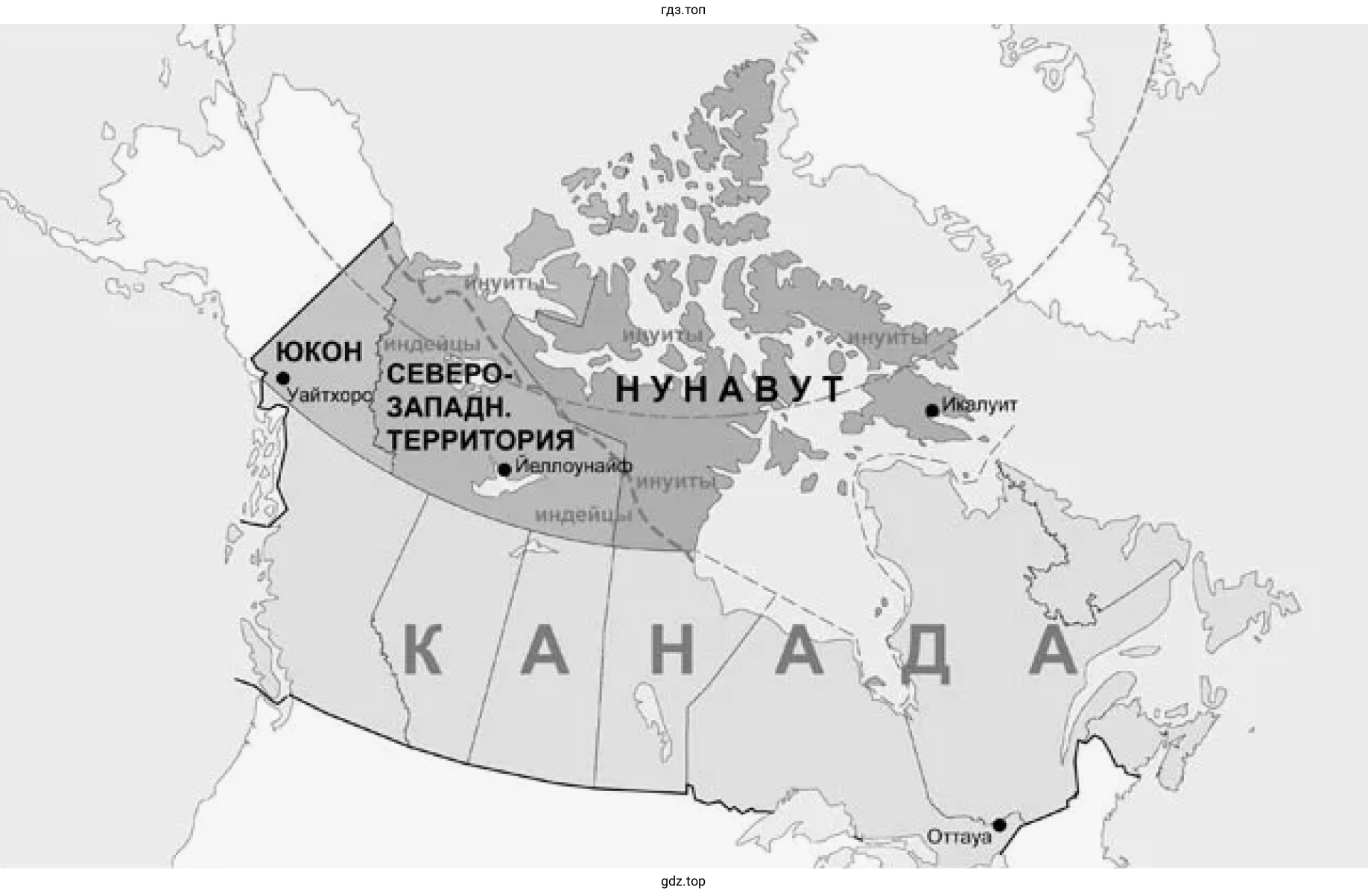 Коренное население Канады - индейцы и эскимосы. Подобно тому как вышел из обихода термин «краснокожие», так и термин «эскимосы» уступил в английском языке своё место термину «инуиты». Найдите на карте Канады места проживания этих народов: Юкон и Северо-Западные территории (где образована автономия инуитов - Нунавик) - и нанесите их на контурную карту.