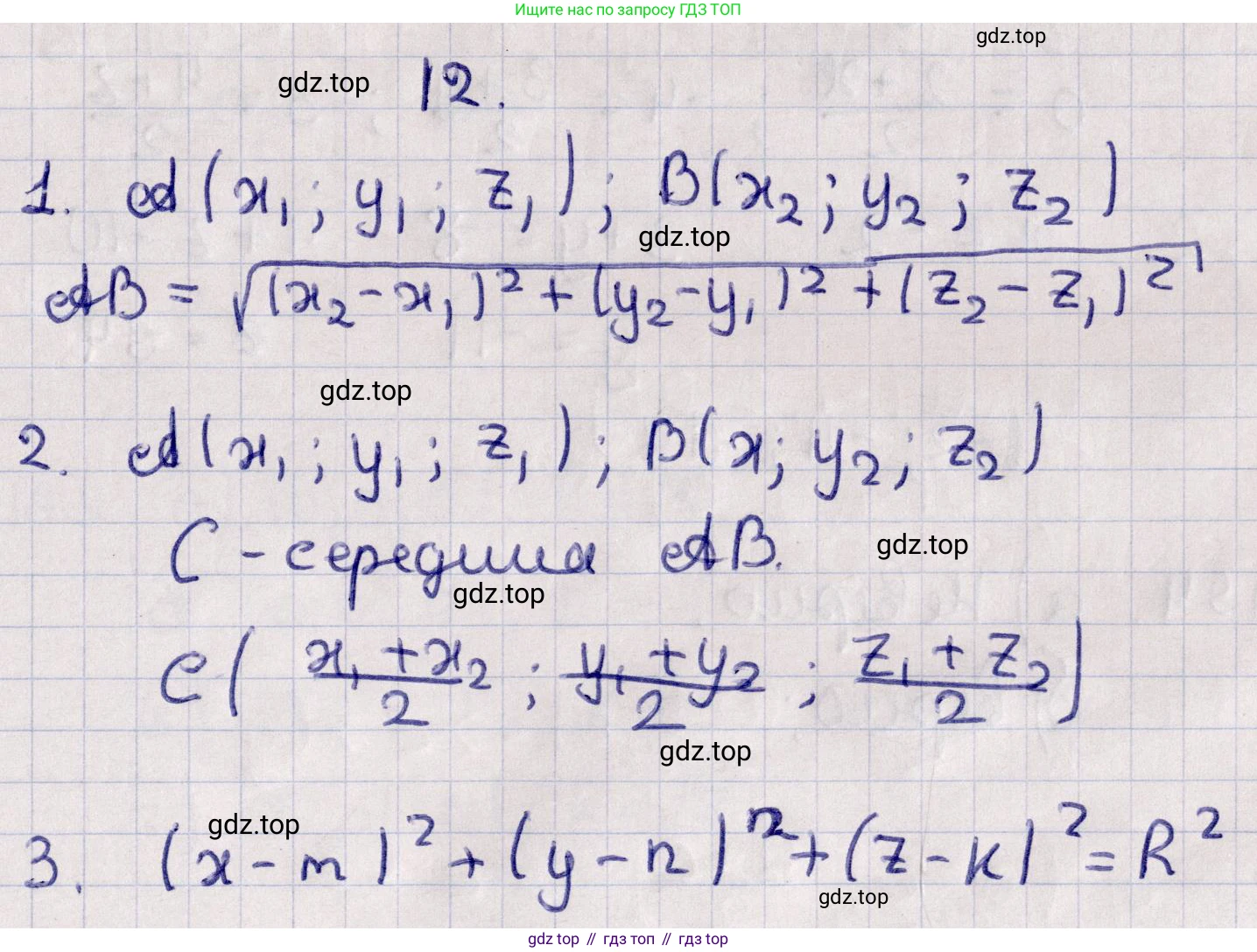 Часть 1. III. Прямоугольная система координат и векторы в пространстве. 12. Расстояние между двумя точками. Координаты середины отрезка. Уравнение сферы - страница 80.