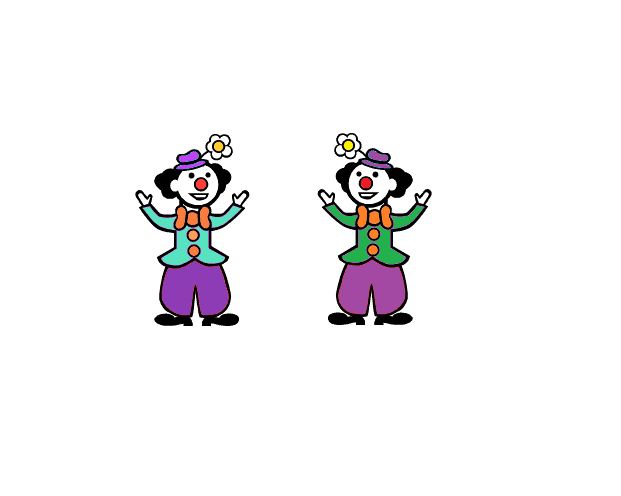 2. Раскрасьте чёрно-белого клоуна так, как раскрашен разноцветный клоун.