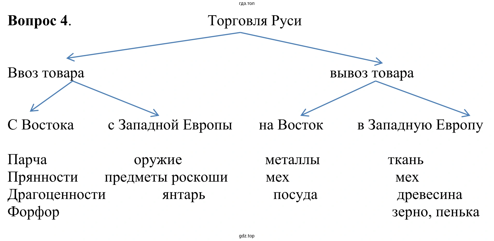 4. Составьте в тетради схему, показывающую, куда и какие товары вывозились из Руси, откуда и какие товары ввозили на Русь.