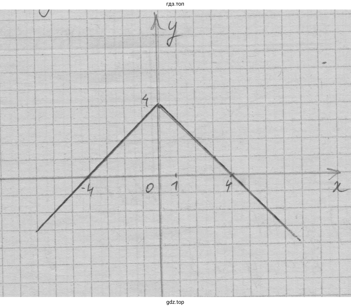 Ответ: График функции $y = 4 - |x|$ получается путем отражения графика $y = |x|$ относительно оси OX и последующего сдвига на 4 единицы вверх вдоль оси OY. Это "перевернутый уголок" с вершиной в точке $(0, 4)$, ветви которого направлены вниз.
