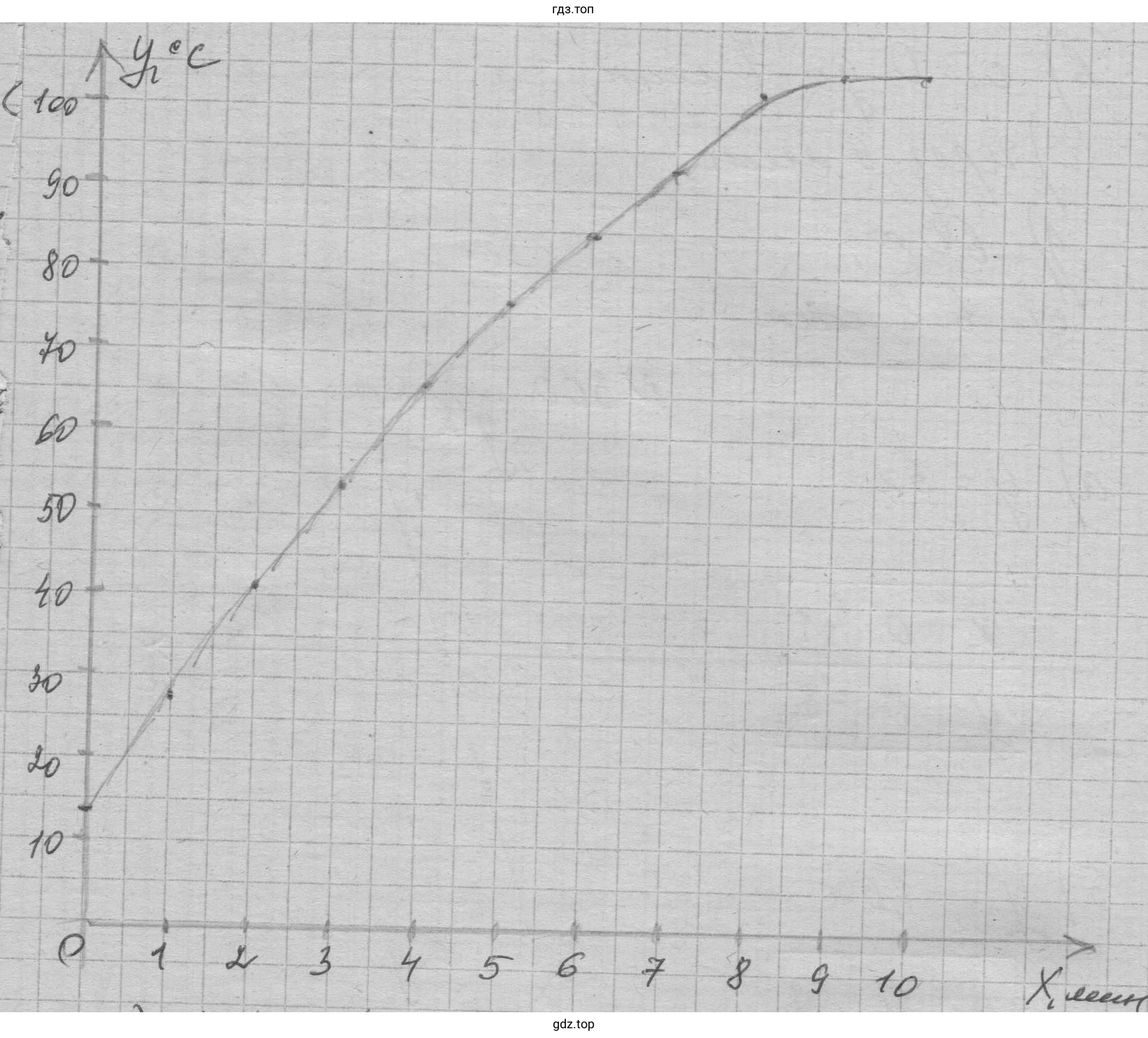 Ответ: через 4 мин — 66 °C; через 5,5 мин — 80,5 °C; через 9 мин — 100 °C; через 9,7 мин — 100 °C.