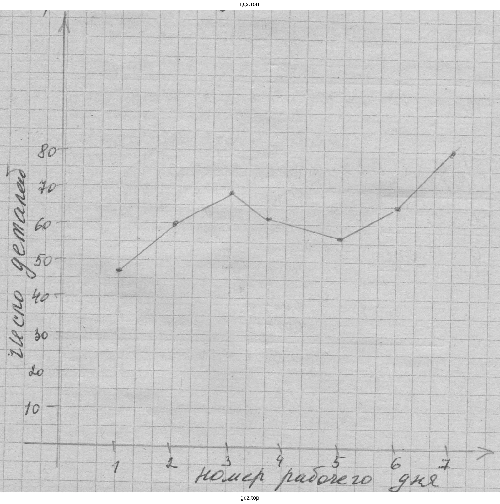 Ответ: График зависимости количества изготовленных деталей от номера рабочего дня построен на основе вычисленных точек: (1; 47), (2; 60), (3; 69), (4; 61), (5; 57), (6; 65), (7; 72).