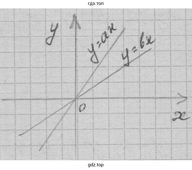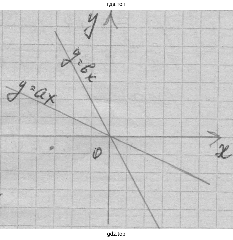 Ответ: Графики обеих функций — прямые, проходящие через начало координат во II и IV четвертях. График функции $y=bx$ расположен "круче" (ближе к оси Oy), а график $y=ax$ — более пологий. В IV четверти график $y=ax$ находится выше графика $y=bx$.