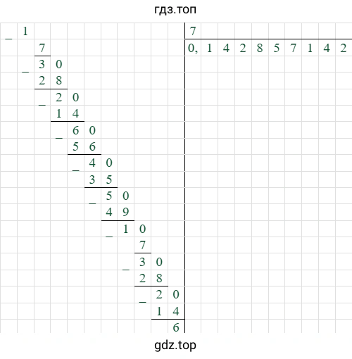 В результате деления получается повторяющаяся группа цифр (период) 142857. Запись: $0,(142857)$.