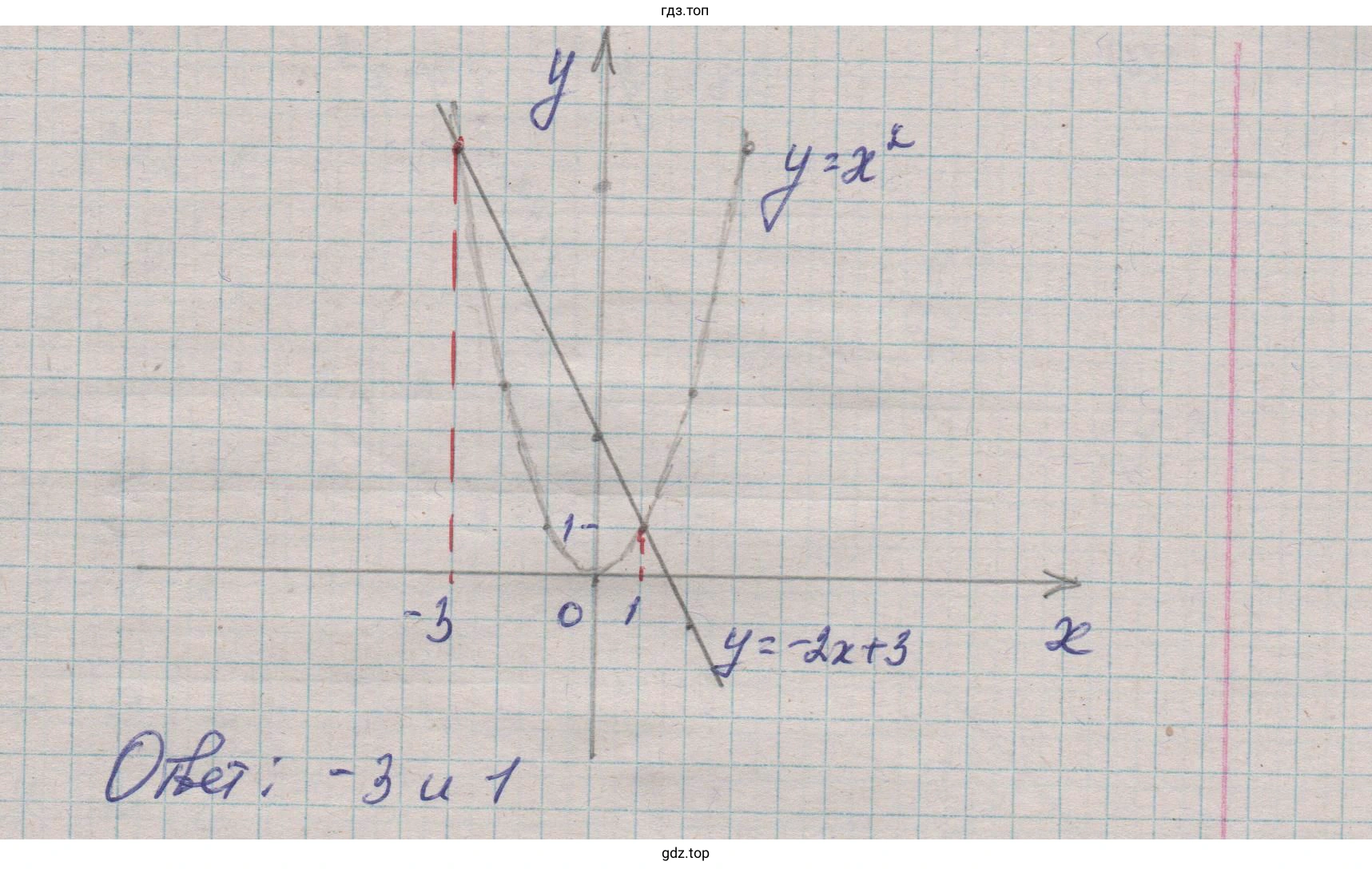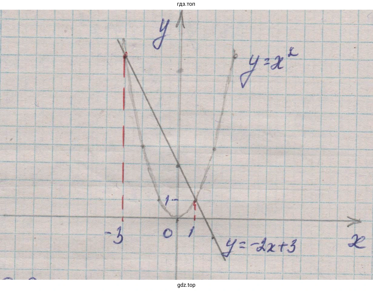- Первая точка пересечения: (-3, 9). (Проверка: $y = (-3)^2 = 9$; $y = -2(-3) + 3 = 6 + 3 = 9$).