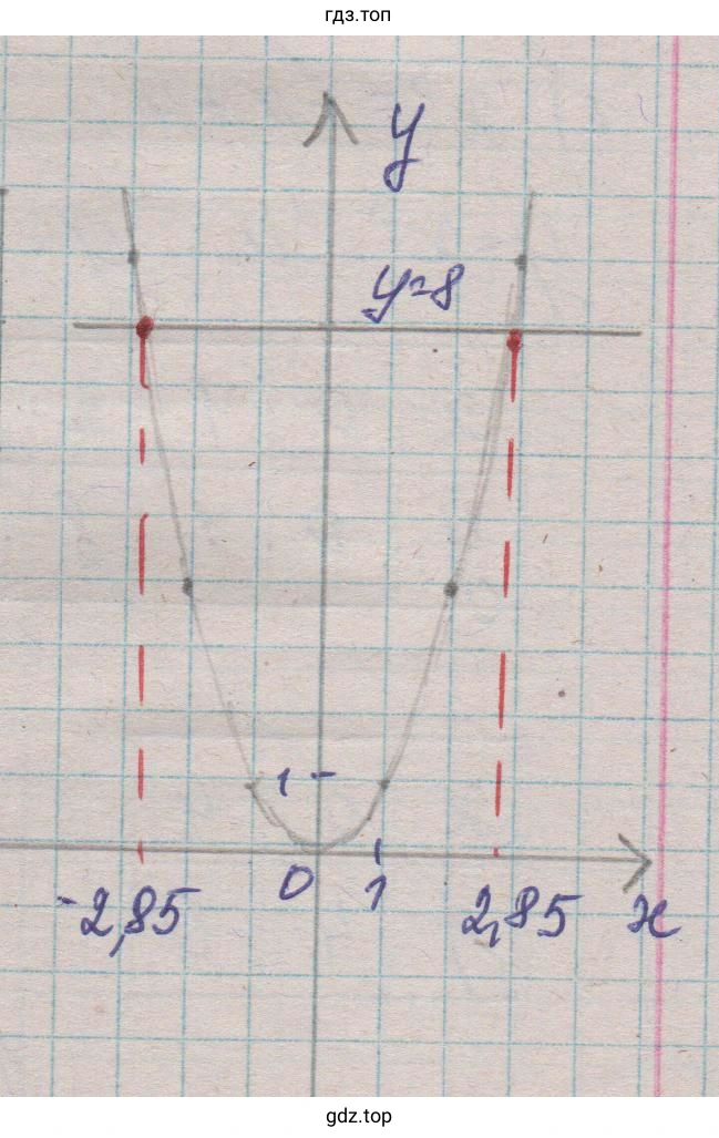 Графики пересекаются в двух точках, симметричных относительно оси OY. Абсциссы этих точек — это значения $x$, для которых выполняется равенство $x^2 = 8$. Отсюда $x = \pm\sqrt{8}$. Упрощая корень, получаем $x = \pm\sqrt{4 \cdot 2} = \pm2\sqrt{2}$.