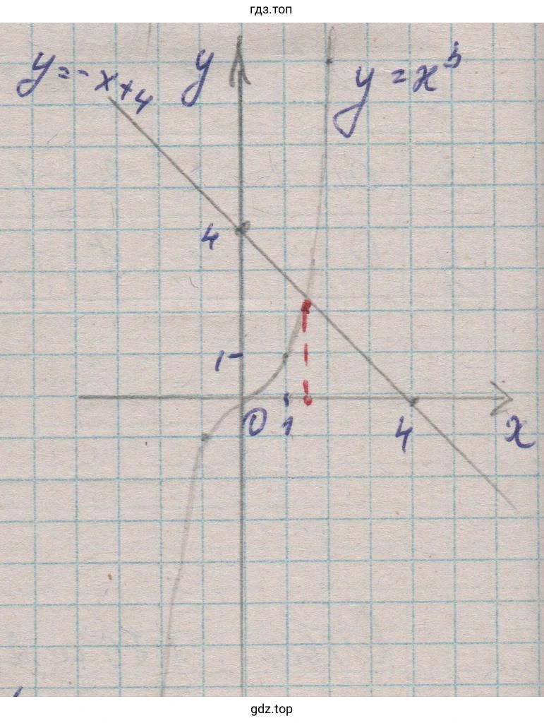 Функция $y = x^3$ возрастает на всей числовой оси, а функция $y = -x + 4$ убывает. Это означает, что их графики могут пересечься не более чем в одной точке. Построив графики, мы видим, что они действительно пересекаются в одной точке. Абсцисса этой точки лежит в интервале между 1 и 2. Поскольку точное значение корня не является целым или простым рациональным числом, графический метод дает приближенный результат. По графику можно оценить, что $x \approx 1,4$.